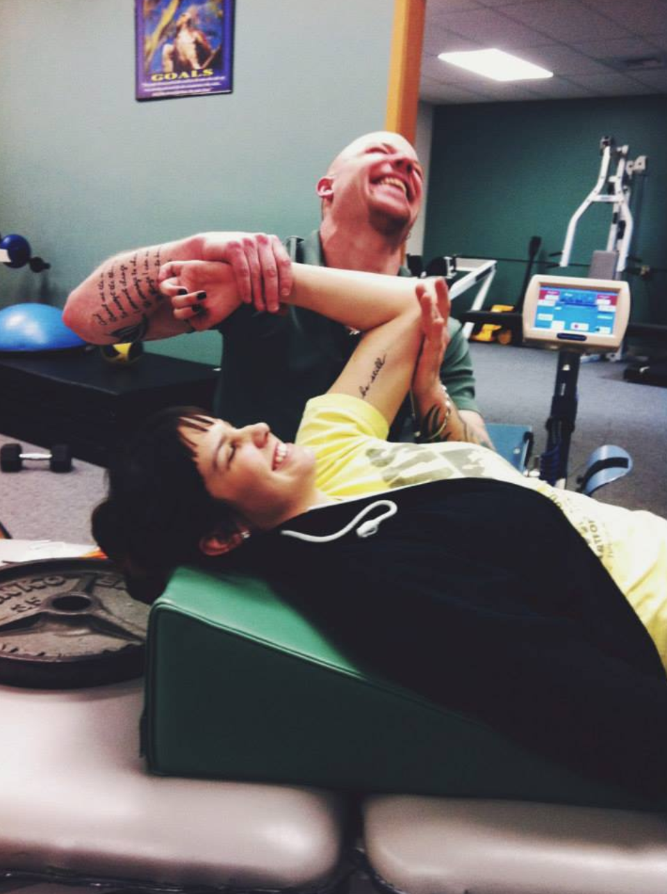 Initially after Emma was home from the hospital, she would have physical therapists come to the house about 2-3 times a week. After home therapy, she started PT back at Harborview 2-3 times a week. Once the PT therapist at Harborview did all they could for her, Emma started looking into other therapist options so she could continue to better herself. Her PT focus at Harborview was to get her using the mobility and functions she could at the best she could to give her as much independence as possible. Once she, for lack of a better word, graduated from that she moved onto another office to keep her body moving. Now that she had been working on the muscles that she could move, she still wanted to keep moving the muscles that she couldn’t and that’s where this new physical therapist came in.